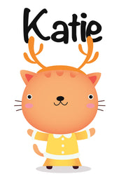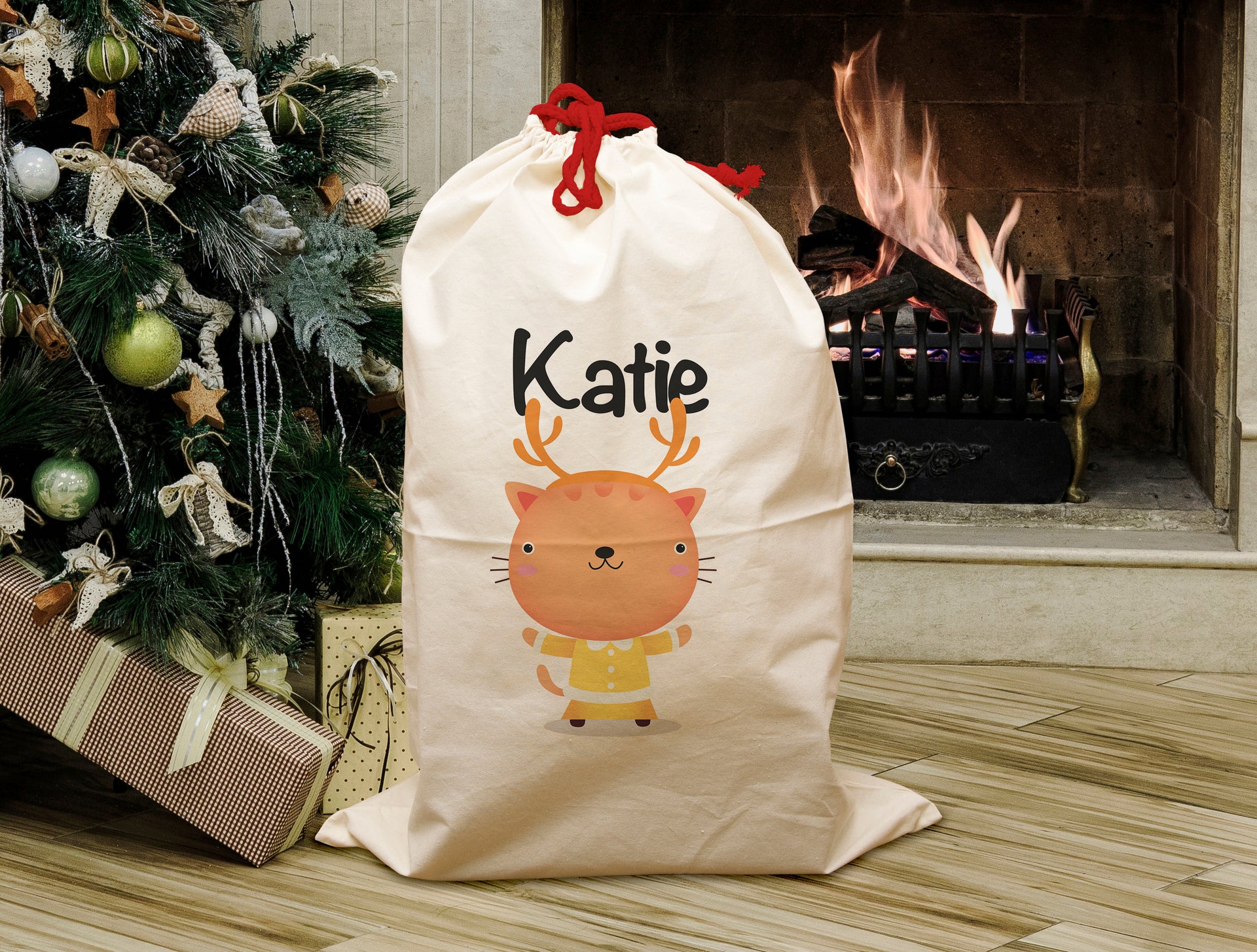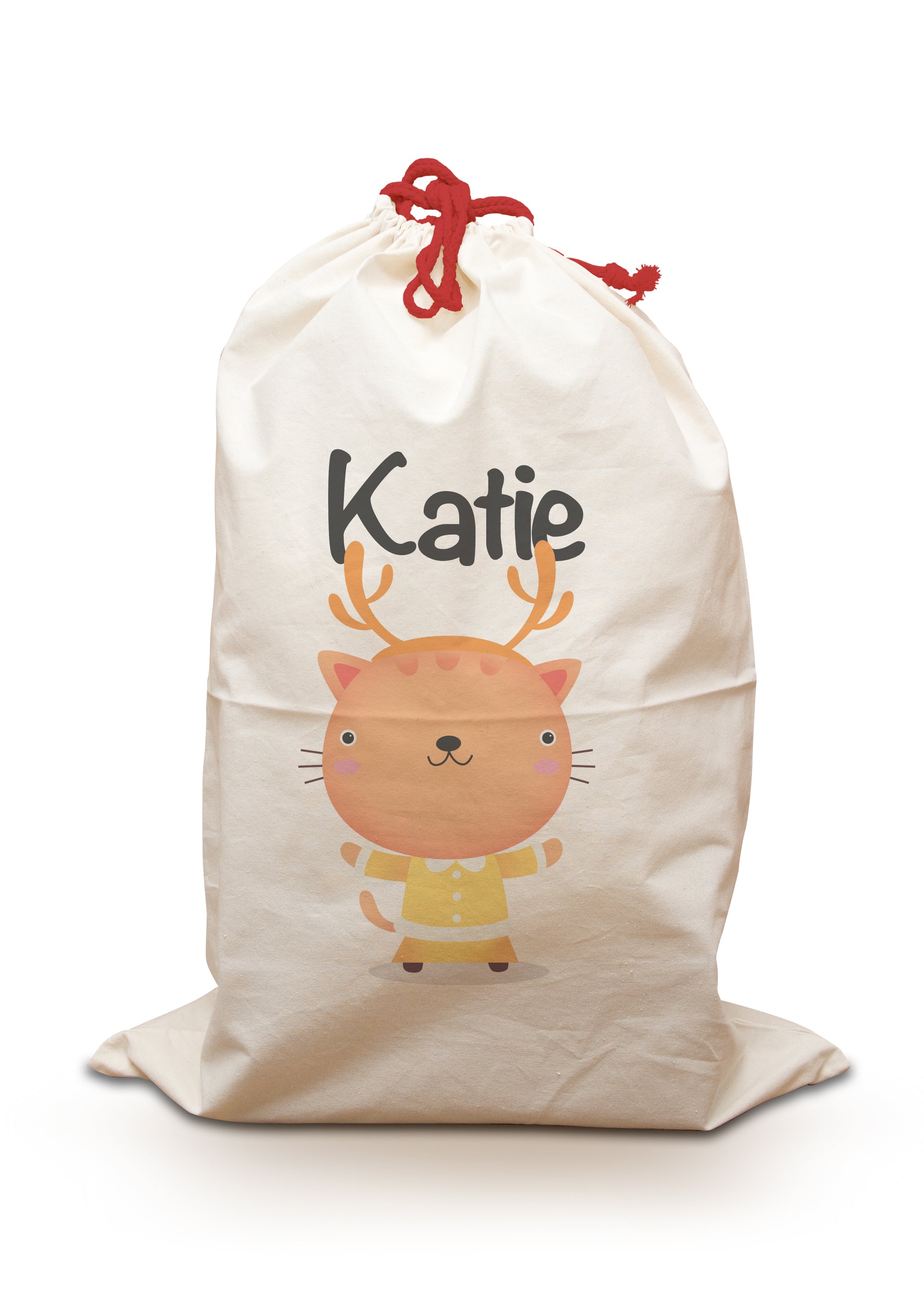 Cute Christmas Cat Character with Antlers, Personalised Santa Sack.