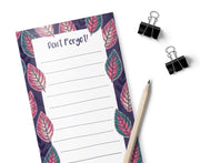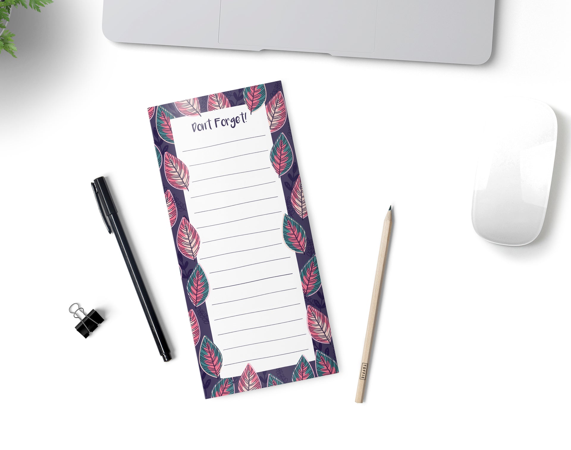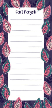 This design features tropical rubber plant leaves in a vibrant pink and deep turquoise around the border and hand drawn lines for keeping your list on!