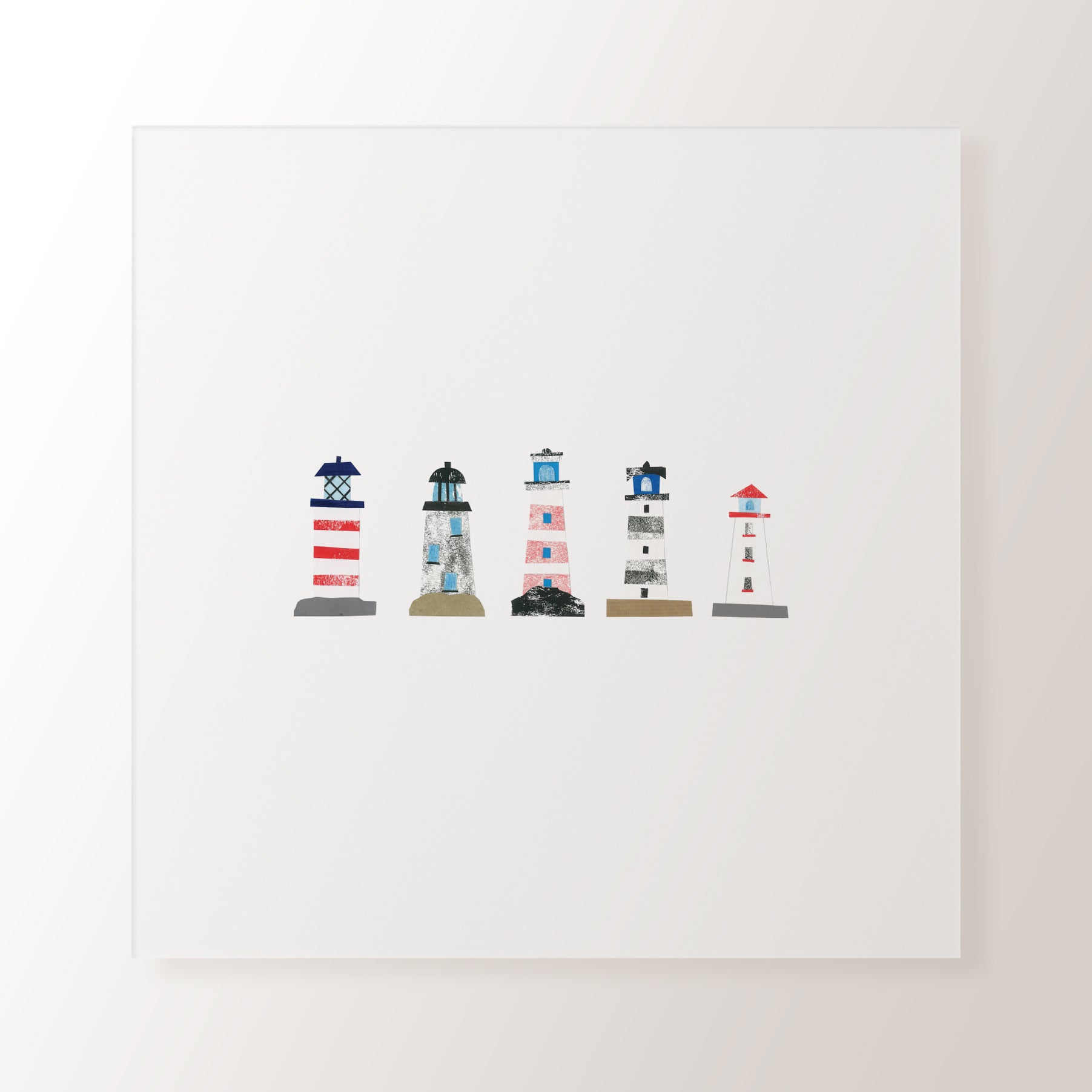 Get a real feel for the seaside with this collaged light houses print! Perfect for any bathroom, bedroom or kitchen- this design is an ideal present for any new home owners or if you're decorating yourself!