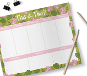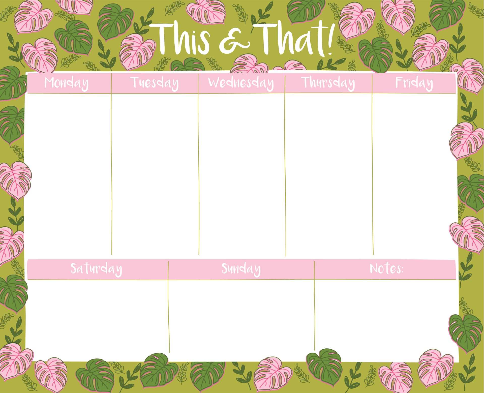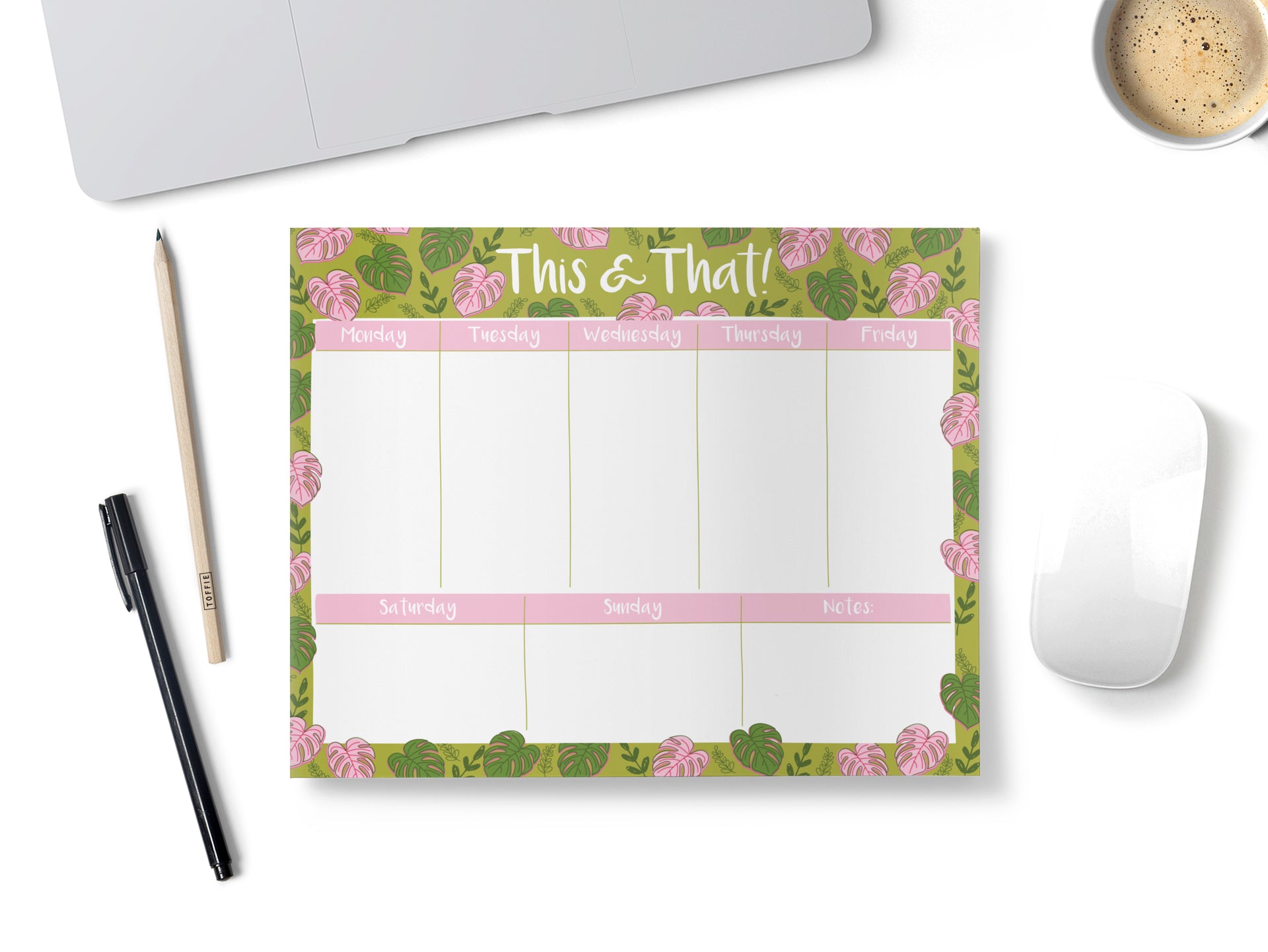 This design features tropical cheese leaves in a vibrant pink and contrasting green around the border and hand drawn lines for keeping your list on!