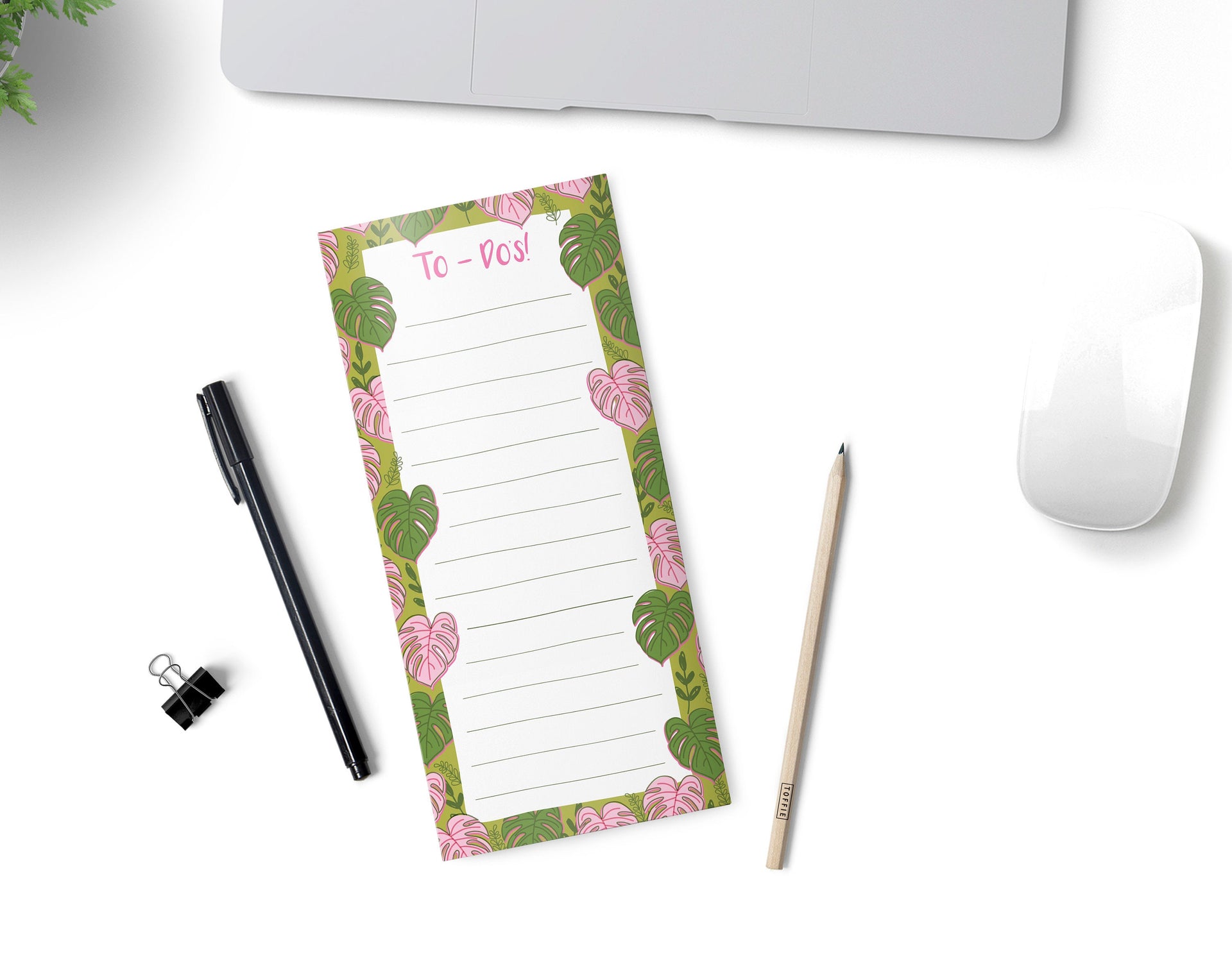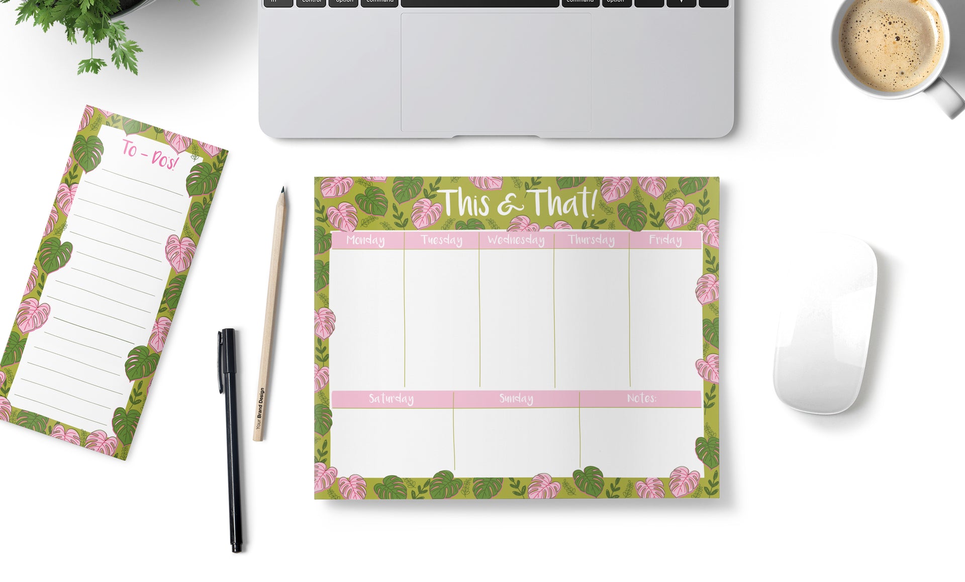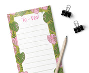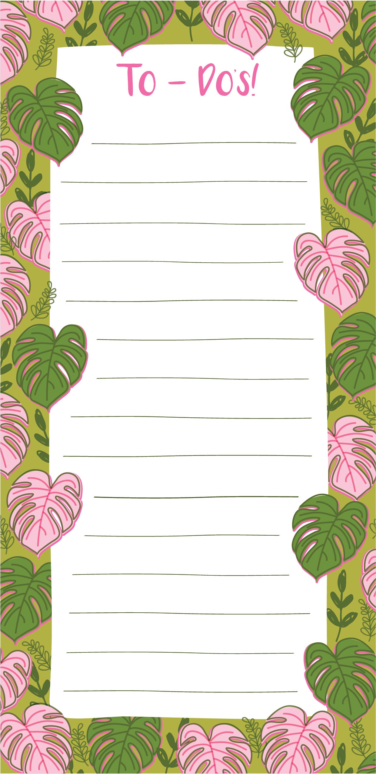 This design features tropical cheese leaves in a vibrant pink and contrasting green around the border and hand drawn lines for keeping your list on!
